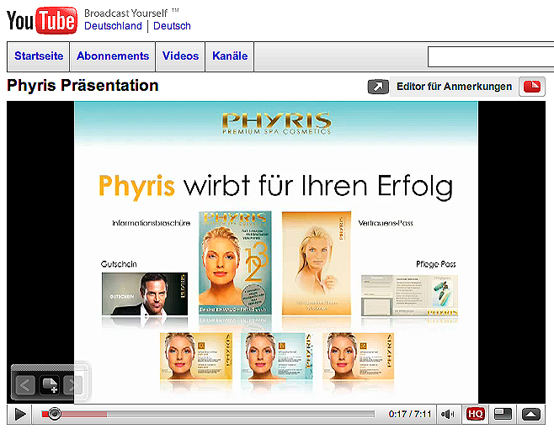 Die Firma Apple Inc. lieferte uns das pfiffige Programm »KeyNote«, mit welchem man wirklich tolle Animationen schaffen kann. Eindrucksvoll dokumentiert der Messeauftritt der Premium-Kosmetik »Phyris« diese Qualitäten.